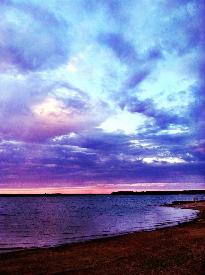 Featured image: my painting, Hillsdale Lake, and the photo I took (below) that inspired it (taken at Hillsdale Lake in Kansas).