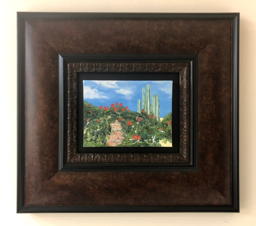 Above: San Juan Capistrano Cactus – oil on canvas (6″ x 8″ framed in a 20″ x 18″ frame – shown with and without a frame) – FOR SALE.