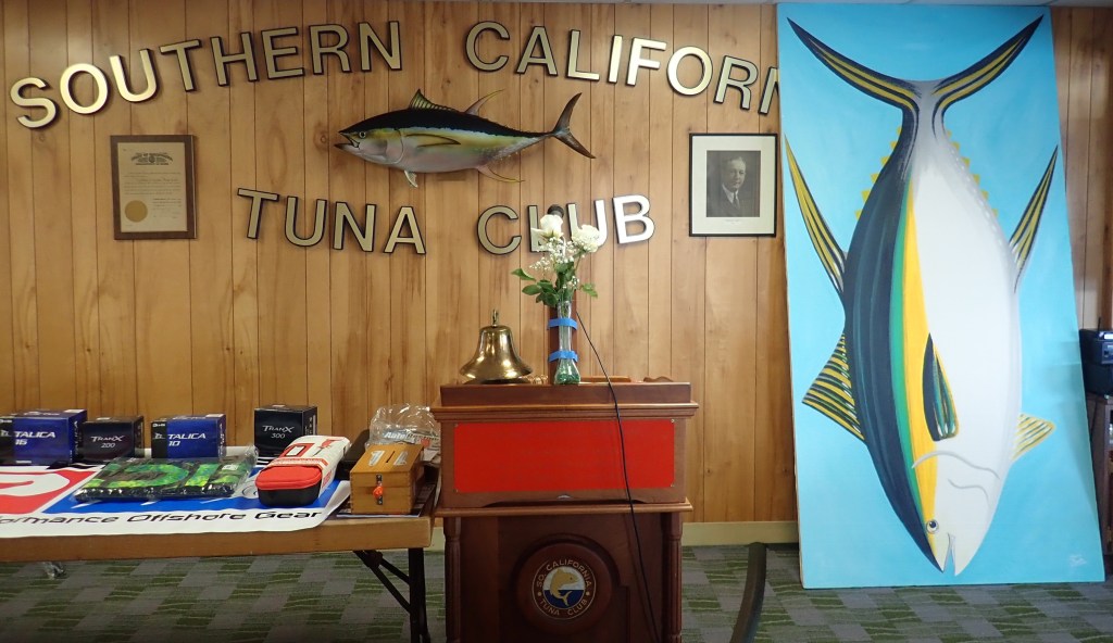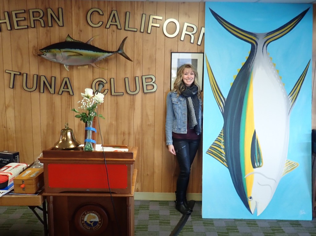 Above: Yellowfin Tuna – acrylic on construction board (4′ x 8′). Commissioned by the Southern California Tuna Club for a special members event. Why eight feet tall? Tunas are often around that size, making this a life-sized painting. For this event, members would present standing next to the painting to show new members how large these fish can be! (Top left photo is me standing next to my painting).